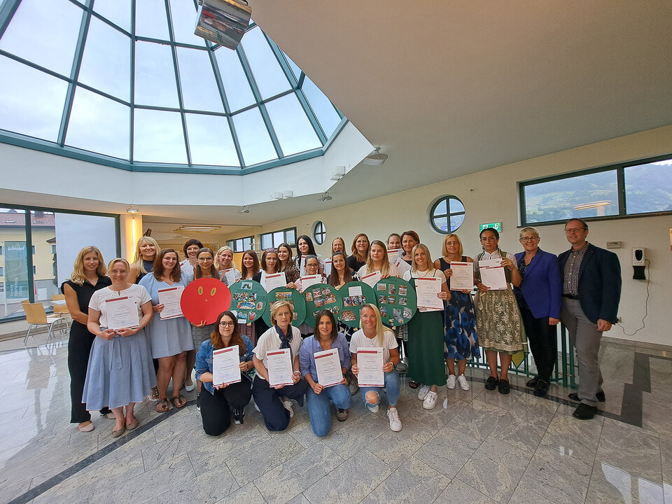 24 Absolventinnen des Lehrgangs „Pädagogische Zusatzkraft“ in Oberndorf und 22 Absolventinnen in St. Johann erhielten vor kurzem ihr Abschlusszertifikat. Ein Semester lang wurden die Teilnehmerinnen in Theorie und Praxis auf ihre Abschlussarbeit vorbereitet. Sie setzten sich mit elementarpädagogischen Grundlagen der Didaktik, Pädagogik, Psychologie, Kommunikation und zentralen Begriffen wie etwa Haltung, Werte und Diversität auseinander. Darüber hinaus erwarben sie Wissen und praktische Handlungskompetenzen in den Bereichen Musikalität, Kreativität, Sprache, Bewegung, Gesundheit/Hygiene, Spiel u.v.m. Diese neu gewonnenen Kompetenzen und Fähigkeiten setzen sie nun in unterschiedlichen elementarpädagogischen Bildungs- und Betreuungseinrichtungen im Bundesland Salzburg ein.